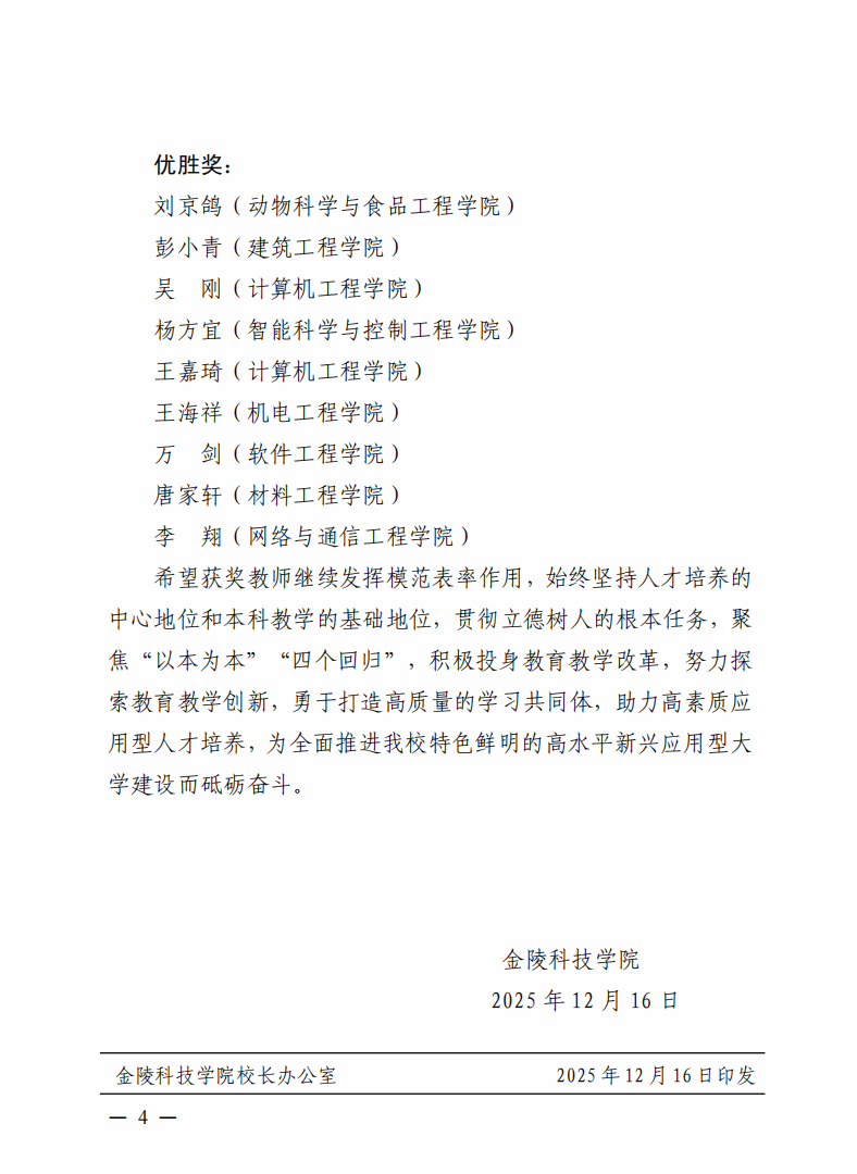 近年来,学院以“以赛促练、以赛促教”为抓手,通过常态化教研、青年教师导师制等举措,推动人工智能与教学融合、产教协同及课程思政建设,持续提升教育教学质量。未来,学院将发挥获奖教师示范引领作用,深化教学改革,为学校高素质应用型人才培养贡献力量。(通讯员:查慧慧)