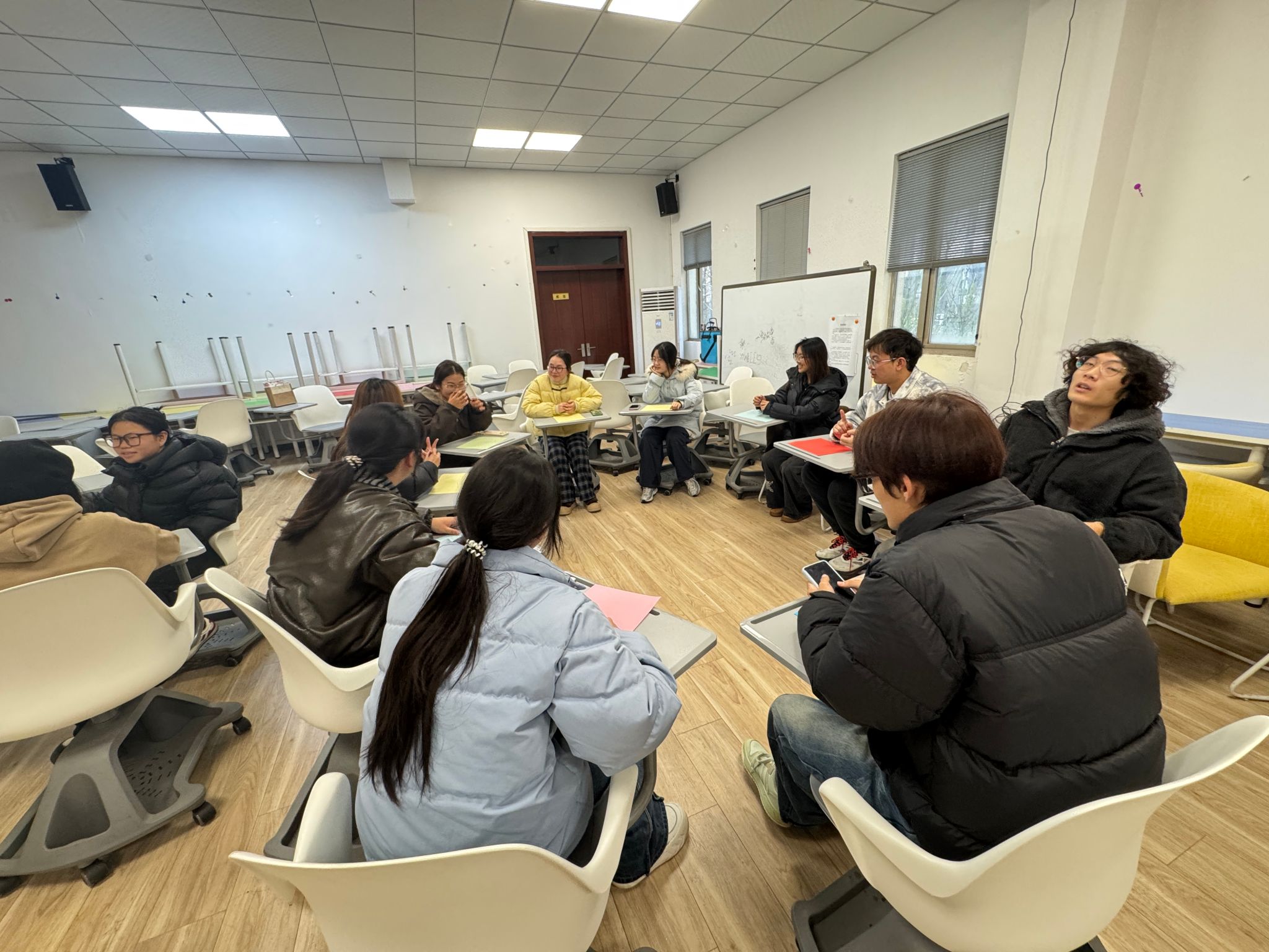 活动伊始,陈智慧引导同学们按圆形、三角形、不规则图形分组围坐,以姓名接龙的趣味形式快速破冰暖场,在轻松互动中拉近彼此距离,营造开放包容的团体氛围。随后,同学们通过绘制动物自画像并逐一分享创作理念,以独特视角探索自身性格特质与内在优势,在表达与倾听中深度认识自我、接纳自我。活动中,大家还一同提笔写下了想对大四的自己说的话,将当下的期许、目标与力量注入文字,为未来成长蓄力赋能,明晰生涯发展方向。