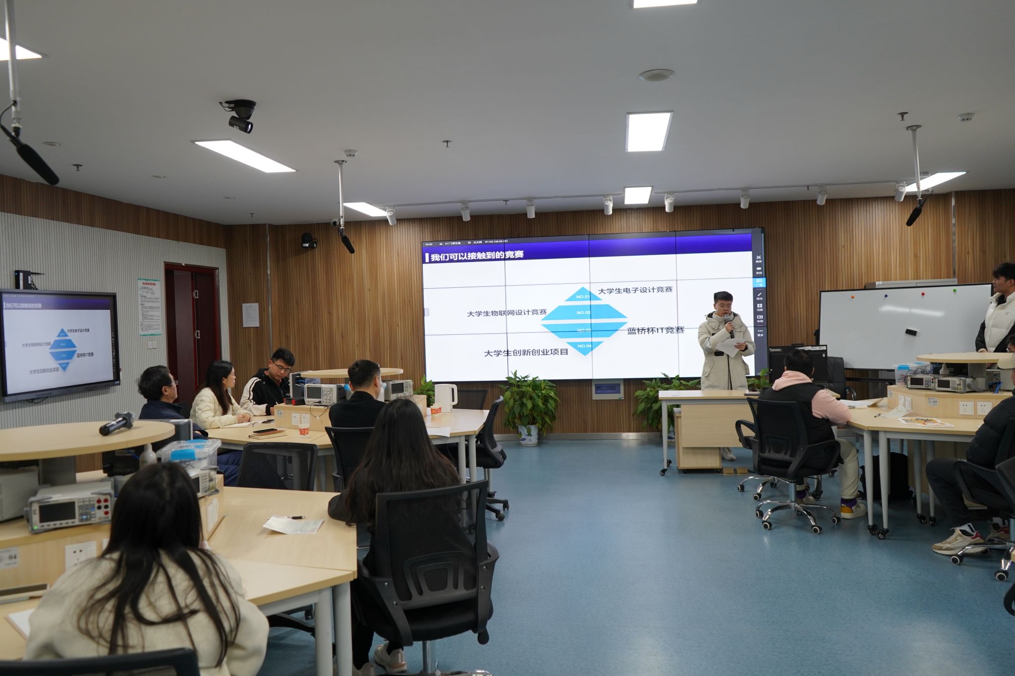 围绕“学风建设”这一主线,本次班会活动共分为“爱党强国”、“学科创新”、“职业规划”和“志愿服务”四个内容模块。在“爱党强国”模块,班级组织委员、入党积极分子王宇阐述了新形势下合格党员的标准,并向同学们分享了习近平总书记在党的二十大报告中对广大青年提出的寄语和期盼。在“学科创新”模块,班级学习委员吴周承介绍了“大学生电子设计大赛”“蓝桥杯”等学科竞赛的参赛要求以及学院“月桐路”科创团队的竞赛成果,号召同学们“以赛促学”,积极参与赛事实践,勇创科研佳绩。在“职业规划”模块,葛太保等三位同学分享了自己的学习经历和职业规划,帮助同学们认识到当前的主要学习任务和做好职业规划的重要性。在“志愿服务”模块中,学院“晨露”志愿服务团队的冯家毅讲述了关爱老人行动等志愿服务经历,用真实的实践故事引导同学们增强社会责任感和使命感,积极践行社会主义核心价值观。