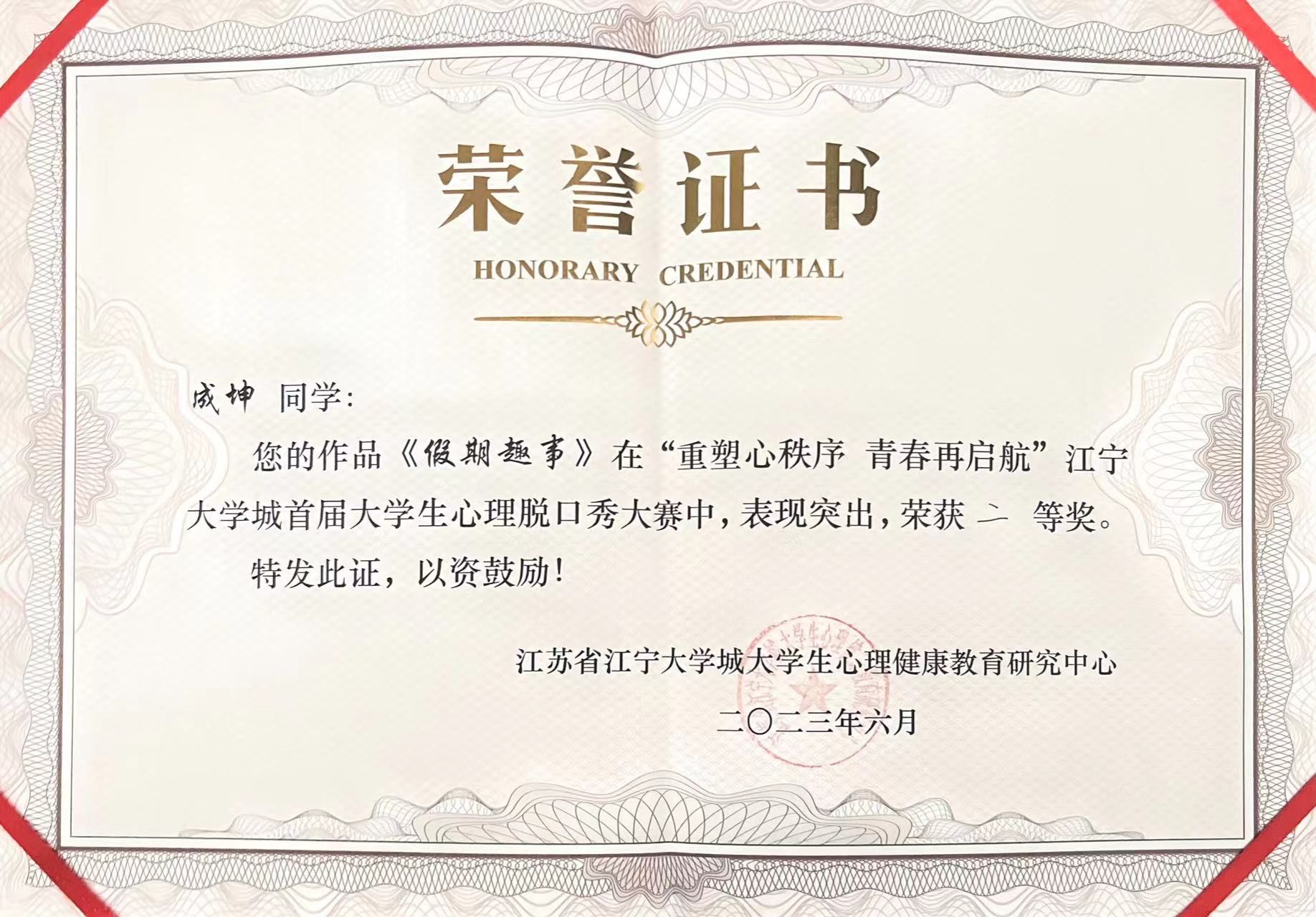 3月26日-3月29日,学院开展“重塑心秩序,青春再启航”心理摄影比赛,号召学生用镜头记录温暖瞬间、感受生命价值。4月19日,由学校心理健康中心主办、学院承办的大学生心理脱口秀比赛拉开帷幕。学生们围绕心理健康问题,自由选取角度进行脱口秀演出。6月9日,从学院大学生心理脱口秀比赛脱颖而出的6776永利集团22级学生成坤作为学生代表参加了“重塑心秩序,青春再启航”江宁大学城首届大学生心理脱口秀大赛。该生凭借创意主题和妙语连珠的演出取得了优异成绩,最终荣获大赛二等奖。