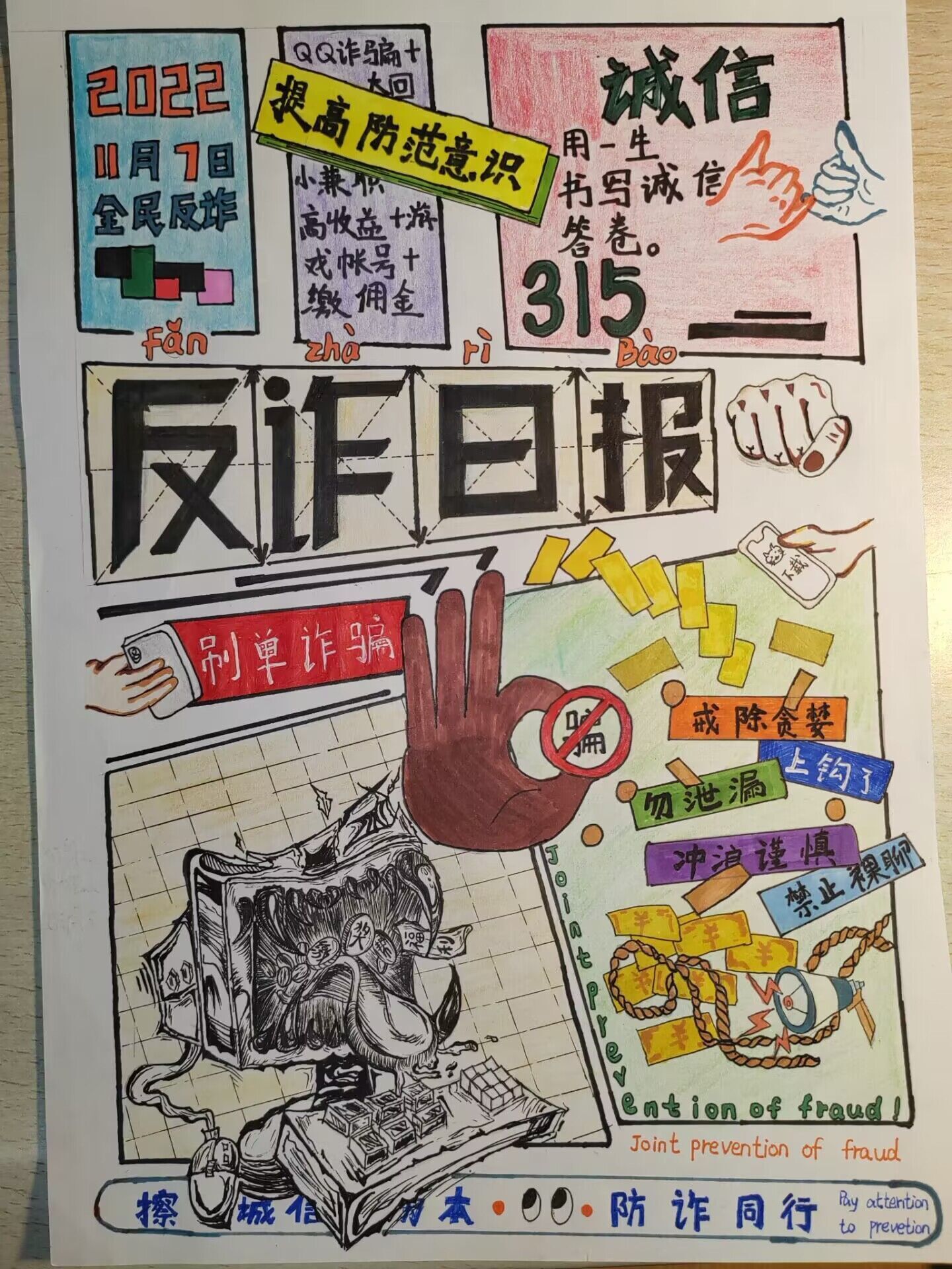 在“防骗守诚,共建诚信之路”主题班会上,学生们通过知识宣讲进一步了解了反诈APP的功能,提高了防范电信诈骗的意识。在图片展活动中,学生们通过图片摄影、手抄报、宣传报等多种形式展现了自身对于诚信教育和防范电信诈骗的深刻理解。在征文环节中,学生紧扣“诚信教育”为主题用文字的形式表达了对诚信的理解。