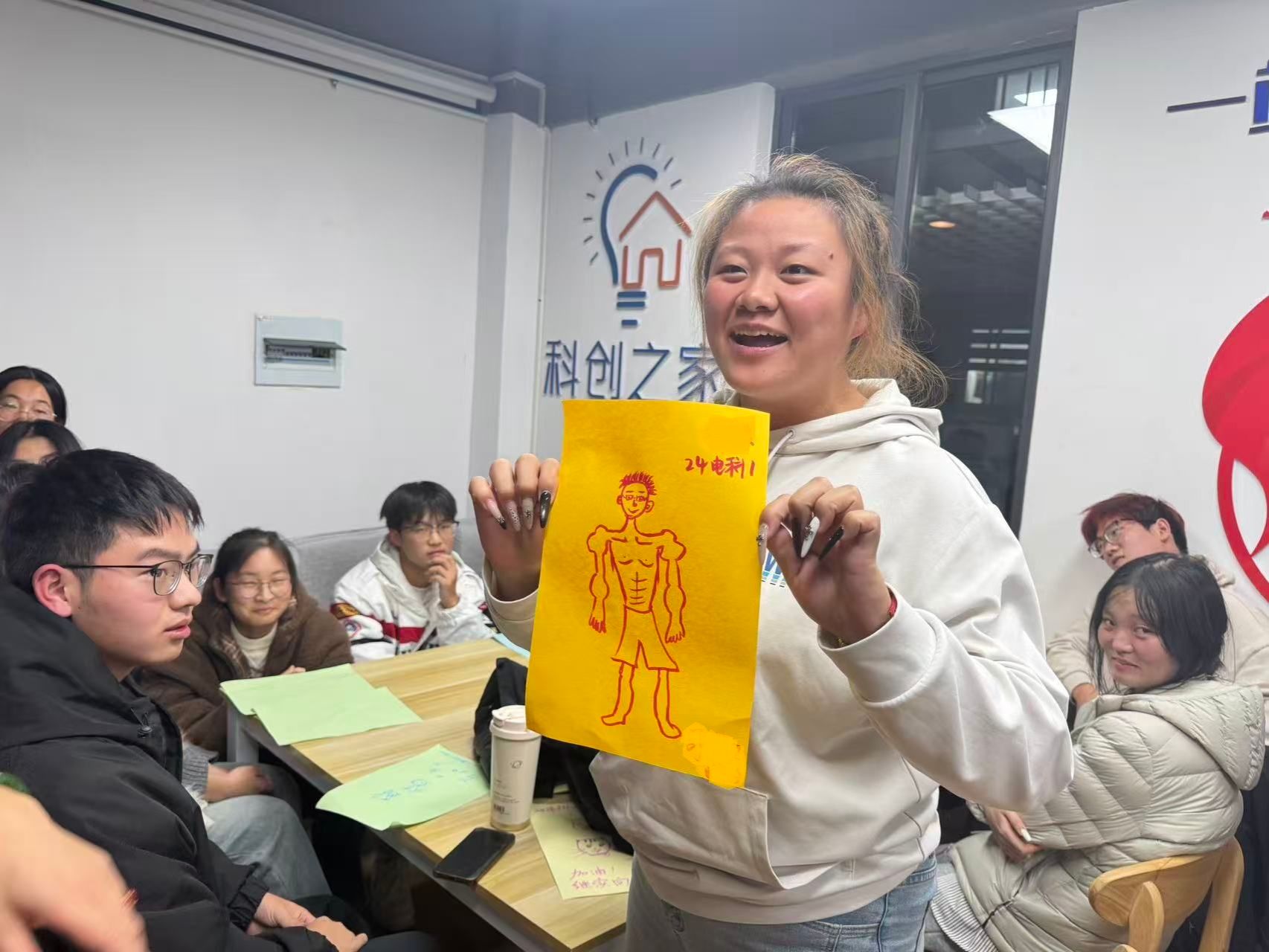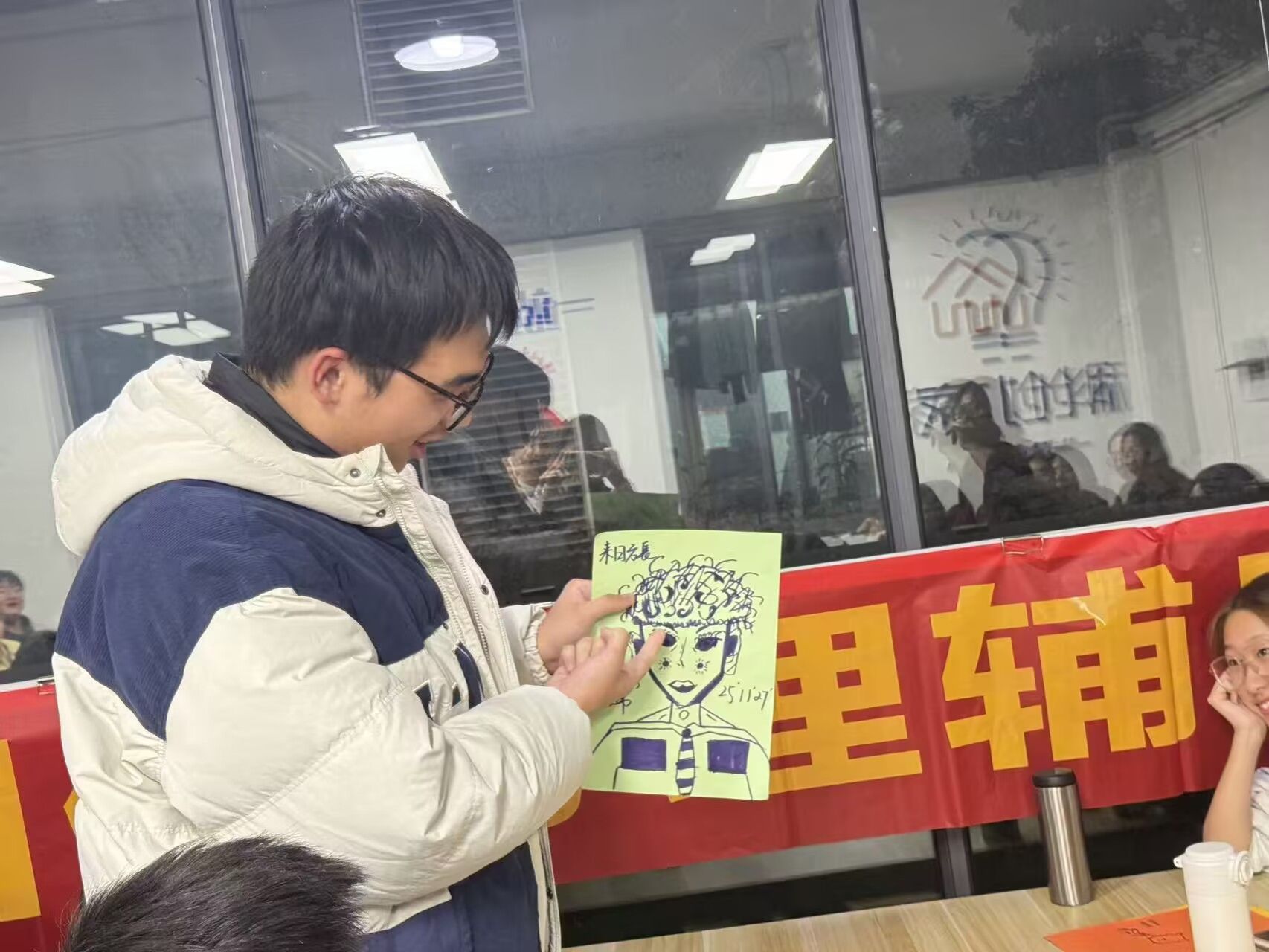 随后活动的核心环节“画·话时光”随即展开。全体同学执笔创作,绘制代表当下自我的“自画像”,并在画旁写下两句话:一句是对自己的肯定与寄语,另一句是对未来自己的期许。这一环节让同学们在静谧的自我对话中,完成了一次深刻的内省与展望。紧接着,活动进入具有象征意义的“接力”时刻。大二同学离场后,2025级各班班委共同构思并绘制“我们的班级未来图景”,用画笔勾勒出对班级的共同愿景:有的班级画下满天星斗;有的班级画下参天大树;还有的班级画出莫比乌斯环链接班级与班干。在分享环节,各班代表热情阐释画作寓意,畅谈班级建设构想,展现了新生骨干对带领班级共同进步的决心与信心。