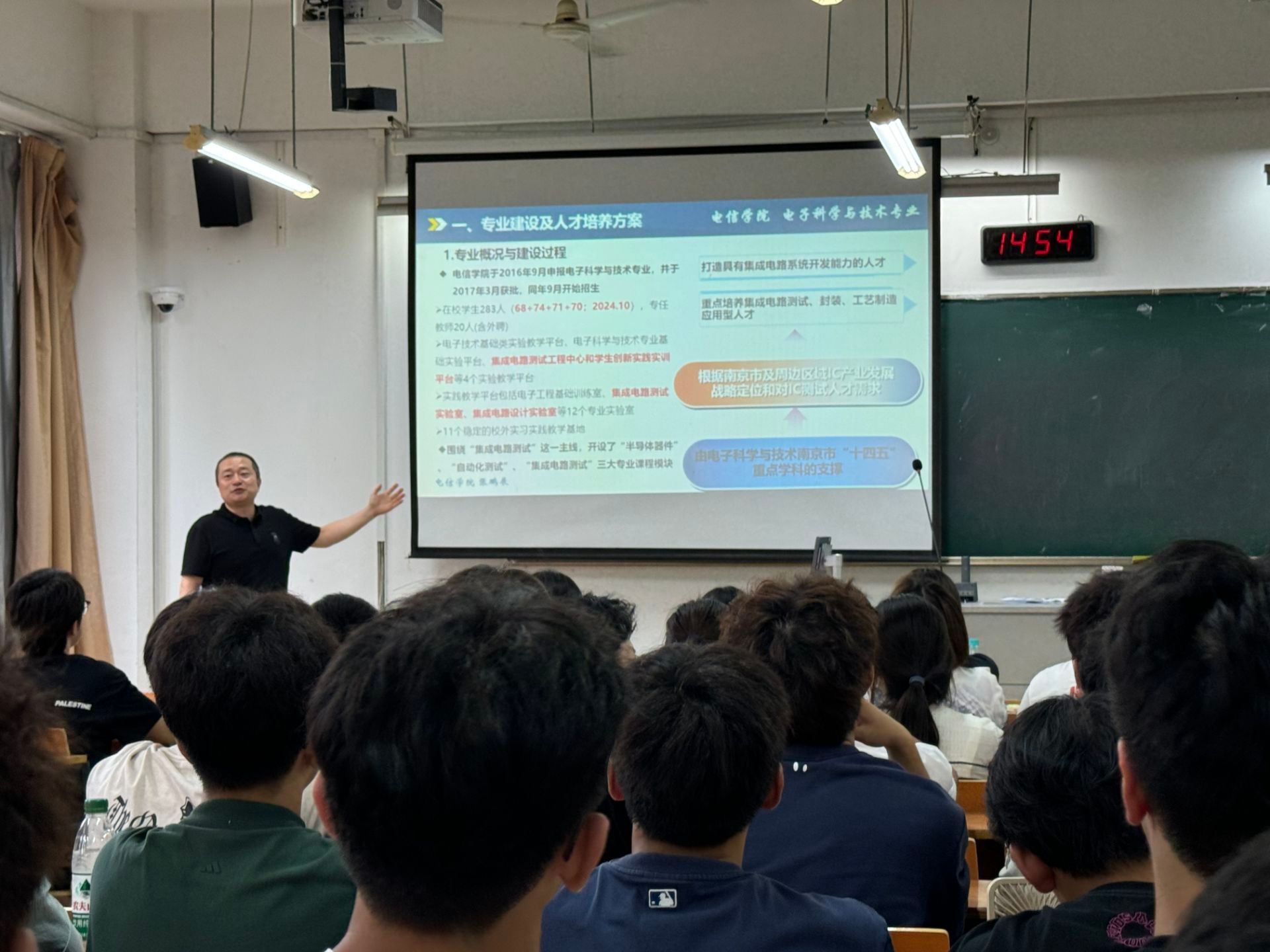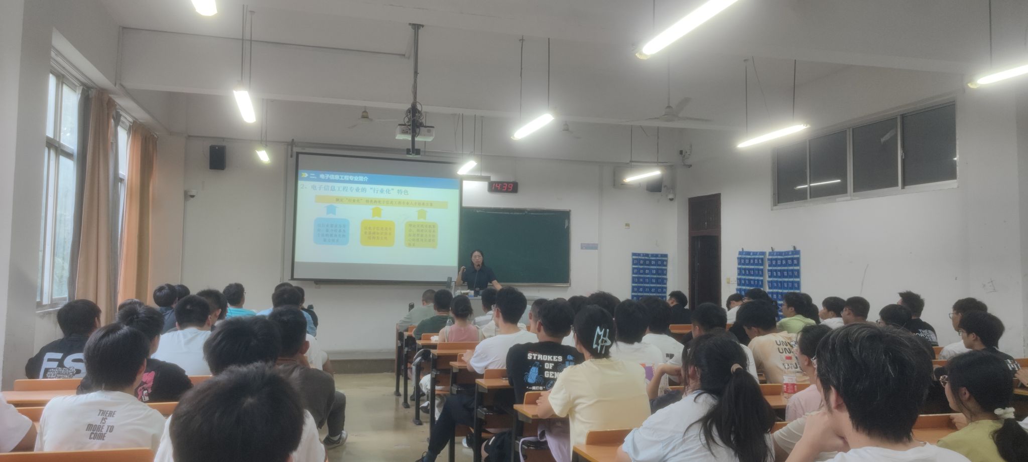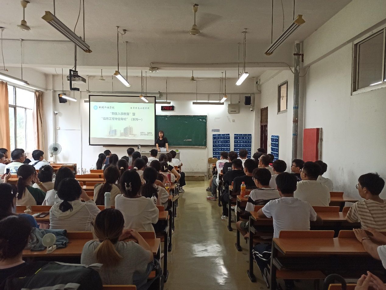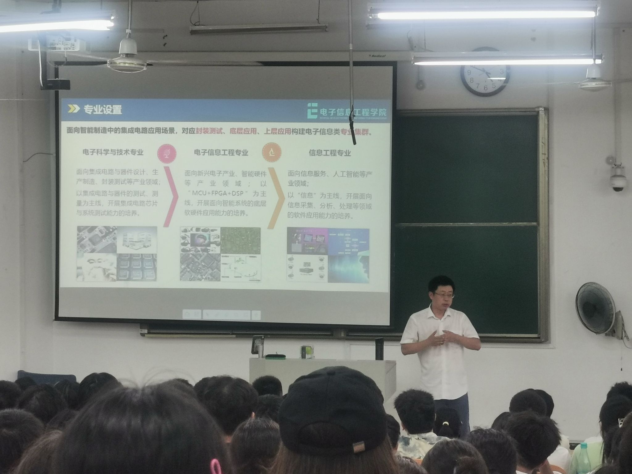 此次活动分两部分进行,一是分专业的入学教育在各系部的拉开帷幕。电子信息工程、信息工程、电子科学与技术三个专业系主任及老师,简要介绍了三个系的发展历程、师资力量、教学设施及科研成果,鼓励新生们积极参与系部活动,拓展视野,提升综合素质,为成为未来的信息科技人才而不懈努力。