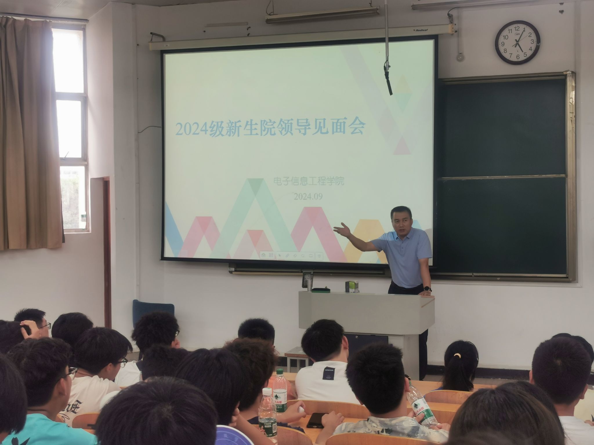 活动的第二部分是全体统招新生的集中见面会。见面会上,学院辅导员根据各自分管工作向同学们详细介绍和解读了学校的相关政策,尤其是对法律法规和校纪校规的遵守、毕业和学位的各项具体规定、评奖评优、党员发展、困难生及创新创业等方面的提醒。辅导员老师们希望同学们能增强自信,保持对专业的热情与专注,顺利、充实地度过美好的大学时光。接着,胡国兵着重讲解了学院人才培养模式和产学研平台优势,指出学院不仅拥有雄厚的师资力量,还有电子信息工程硕士实验点,可以为学生提供良好的学习和研究环境,鼓励新生们充分利用这些资源,积极参与各类实验和项目,争取在未来的职业生涯中脱颖而出。胡国兵从学院发展历史、学科建设、科研团队、就业前景等多个方面对学院进行了充满信心和激情地介绍,激发了同学们对学院学习生活的热情和信心。见面会的最后,徐志国对新生们的到来表示了热烈的欢迎,他引用习近平总书记对当代大学生的期待与嘱托“广大青年要肩负历史使命,坚定前进信心,立大志、明大德、成大才、担大任,努力成为堪当民族复兴重任的时代新人,让青春在为祖国、为民族、为人民、为人类的不懈奋斗中绽放绚丽之花”来激励现场的萌新们,希望同学们能够在电信学院开启人生新的辉煌的篇章。他鼓励新生树立远大的理想和目标,勇敢面对挑战坚定信心,充实自己,为将来的发展打下坚实的基础。