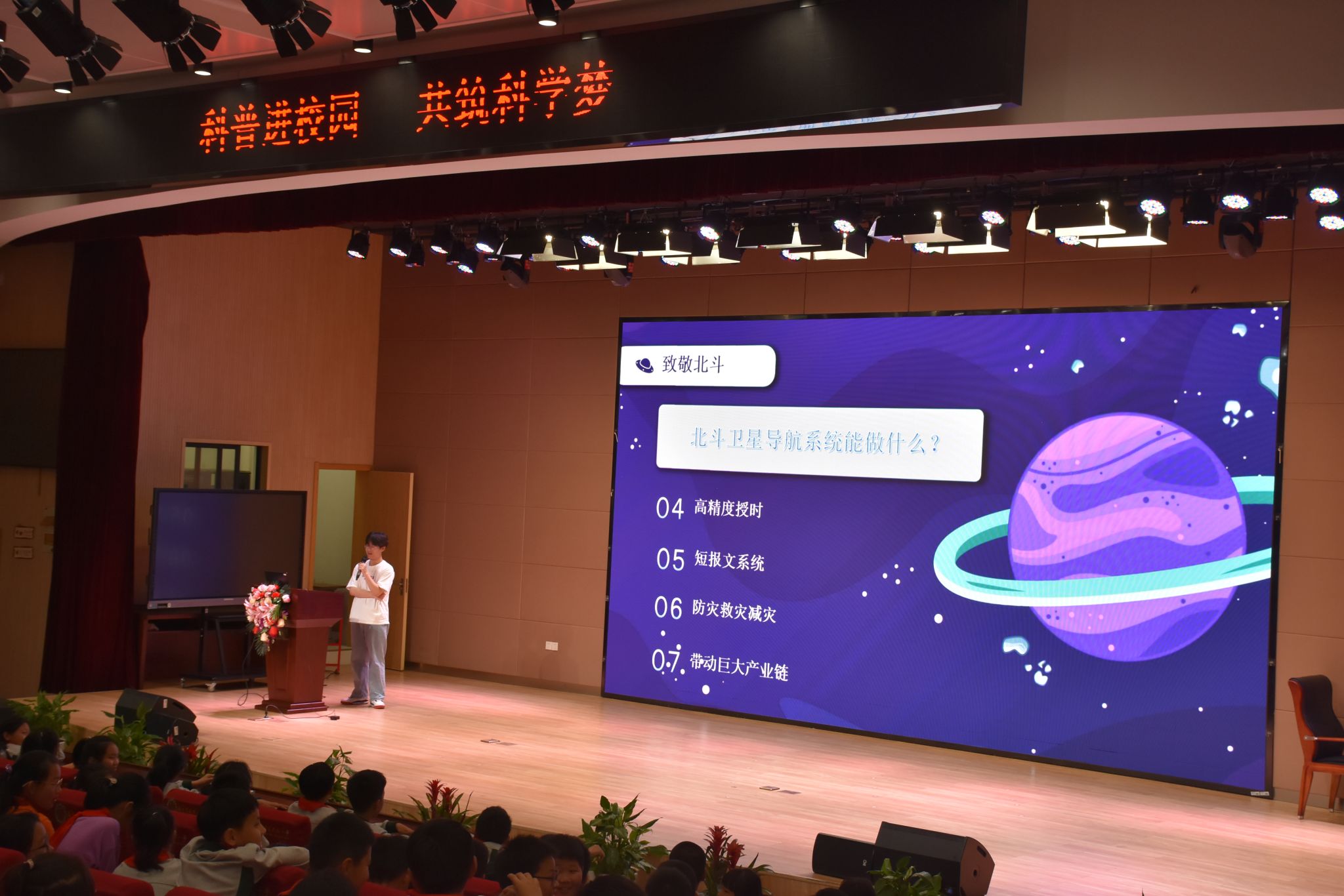 讲座现场,徐李运用扎实的科创知识,借助震撼的视频、生动的语言,介绍了我国北斗事业发展的历史进程和应用现状。徐李通过丰富的实例让学生们了解到科技创新并不是遥不可及,而是与日常生活息息相关。对科学知识怀有浓厚兴趣的学生们神情专注,在轻松愉悦的氛围中感受到了科学技术带给人类的改变。此次科普讲座生动有趣、深入浅出,学生们踊跃回答问题,争相参与互动,掌声和加油声此起彼伏,会场气氛十分热烈。