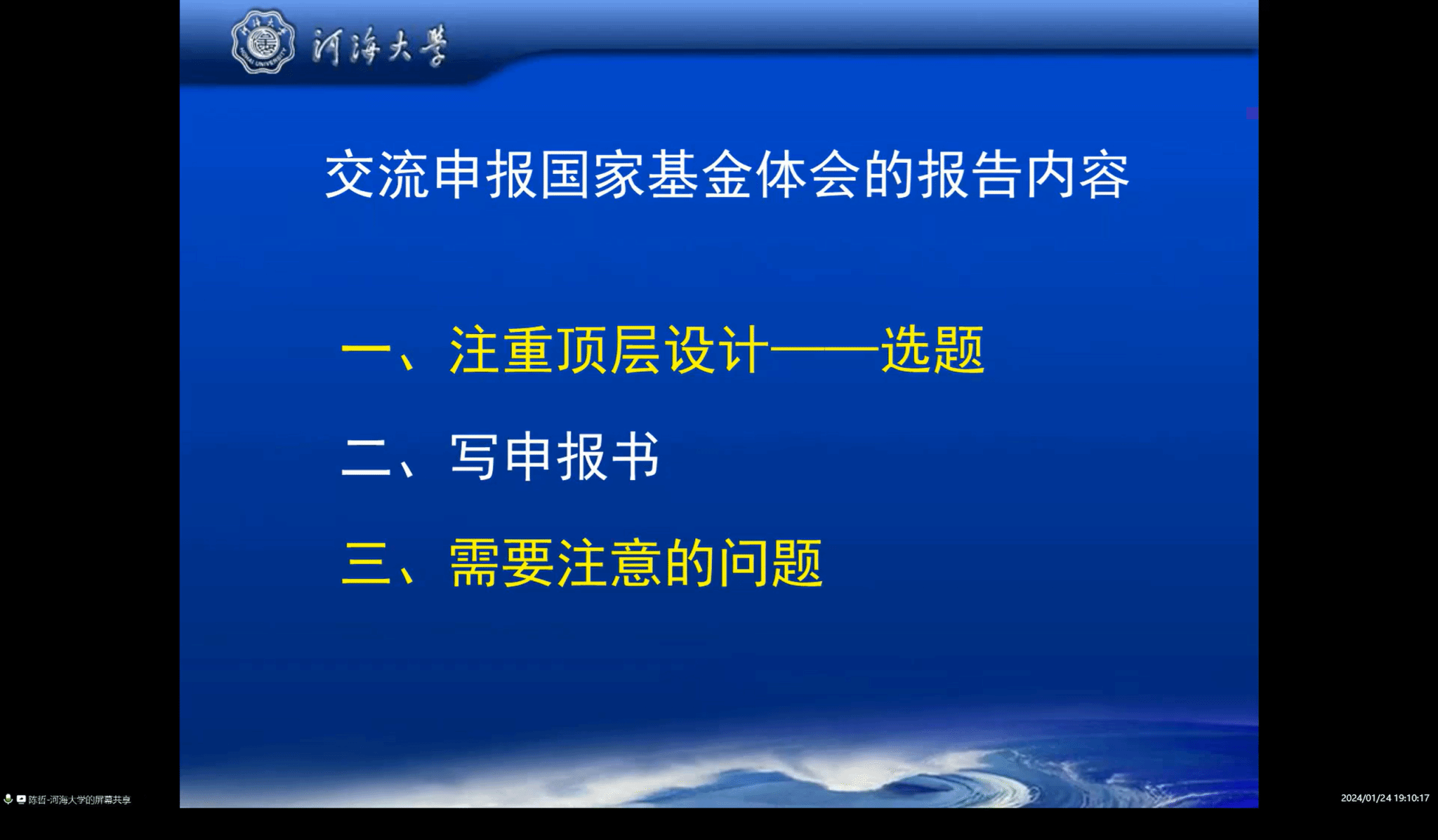 1月24日晚,线上邀请河海大学陈哲教授为学院教师作了题为《申报国家自然科学基金的体会》的讲座,陈教授言简意赅,从申报书的立意、选题,撰写方法等方面为大家分享了国家自然科学基金申报的心得、经验及典型案例。