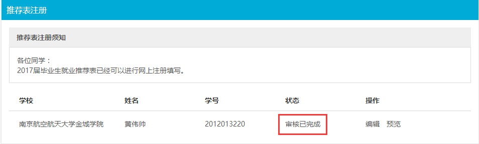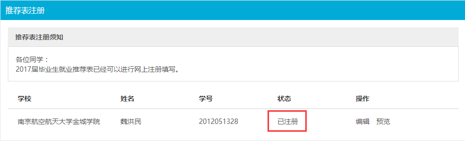 如果状态为“已注册”,说明学校尚未审核,点击“编辑”,进入推荐表编辑页面,修改,重新提交即可。
