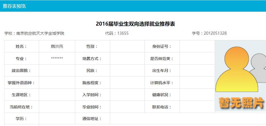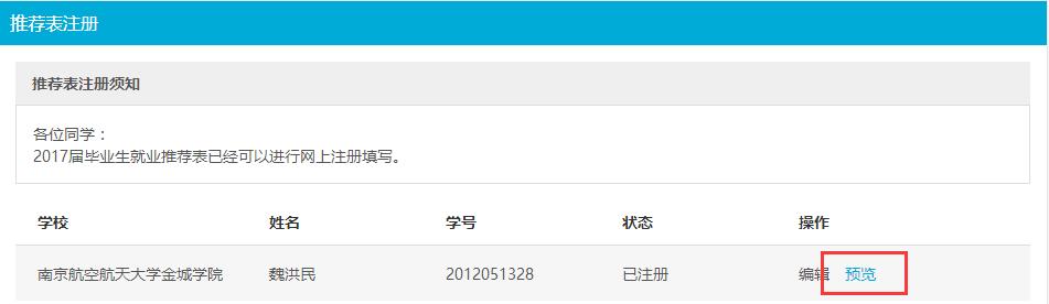 已注册推荐表的学生,可点击“预览”,预览推荐表如图: