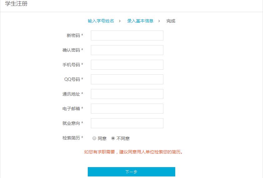 请填写“所在学校”,“学号”,“姓名”,验证码,点击“下一步”。(注:点击下一步后由于状态不同,会出现不同页面,请按下面提示步骤执行)
