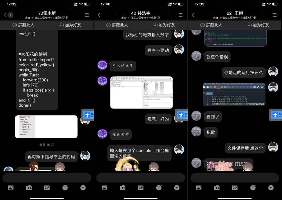 整个线上直播过程不再是单一采用教师全程灌输式讲解的教学模式,而是采用直播与学生自主练习实验、教师答疑相结合的形式,做到讲、学、练、解答、讨论相结合。图8为教学过程中互动答疑的一些展示。