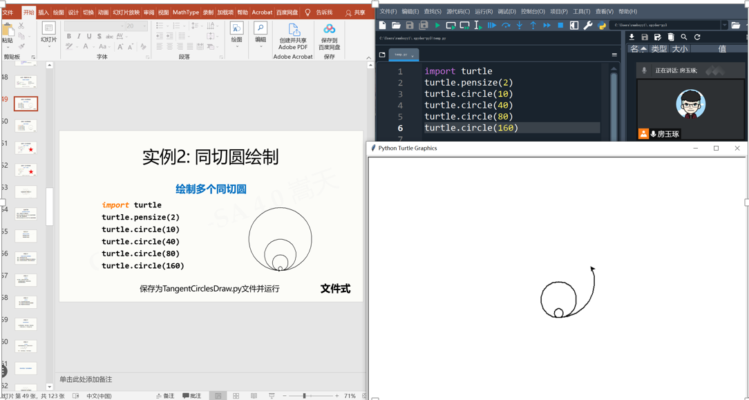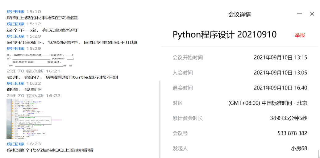 线上课堂教学包含直播教学、Python123网络资源练习和学生编程实验3个部分。其中直播教学采用腾讯会议的方式,课程的前半段以教师讲授为主,讲授的教学课件完全覆盖配套教材和大纲上的内容,在讲授过程中对于重要的知识点进行强调。由于课前已经让所有同学都在自己电脑上部署了编程开发环境,且已调试成功,故对于一些典型实例在直播时,进行实际操作演示,如图5所示,并提醒同学们在听课的同时也跟着老师一起练习,在自己的电脑上进行编程,边听课边实践,大大提高了学生课程参与的主动性。