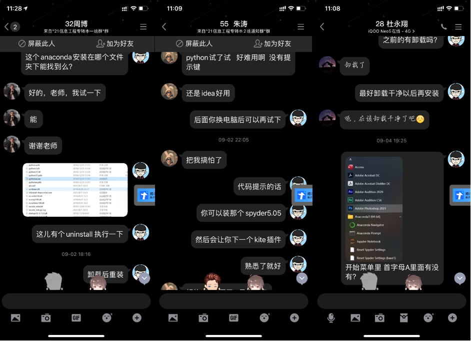 同时,房老师通过教学QQ群发布《Python安装与环境配置》,和学生进行前期互动,指导学生安装好Python集成开发环境Anaconda。学生在安装过程中,由于电脑系统的差异及操作上的不熟悉,存在各式各样的安装问题,房老师面对学生提出的问题,及时给予细致的指导,帮助学生顺利安装好软件,如图2所示,从而为后续上课时使用软件进行编程实验做好了前期准备。