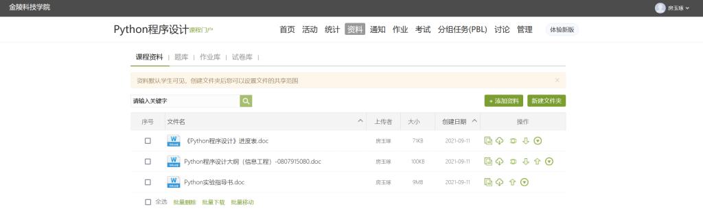 课前房老师根据课程目标充分准备学习资源,引导学生对课程进行预习。在学校对应的网络教学平台——超星学习通中创建了《Python程序设计》课程,将本学期课程的教学大纲、进度表和实验指导书等主要教学资源整理好并上传至学习通平台,如图1所示,学生可通过该平台下载这些共享开放资源,从而做好课前的准备和预习工作。